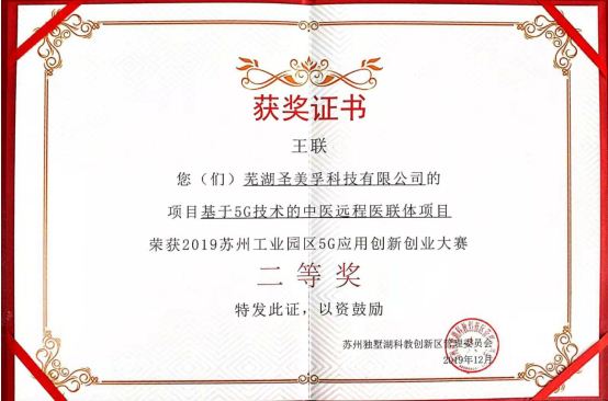 蕪湖圣美孚科技公司以“基于5G技術的中醫(yī)遠程醫(yī)聯體項目”參加此次大賽,與參賽的各種人工智能、大數據和物聯網等5G示范應用場景的高新科技項目同臺亮相,于決賽現場進行了路演,闡述了基于5G技術的中醫(yī)遠程醫(yī)聯體項目成果并接受大賽評委的評審問答,經過一番角逐,我公司參賽的“基于5G技術的中醫(yī)遠程醫(yī)聯體項目”榮獲2019年蘇州工業(yè)園區(qū)5G應用創(chuàng)新創(chuàng)業(yè)大賽二等獎。